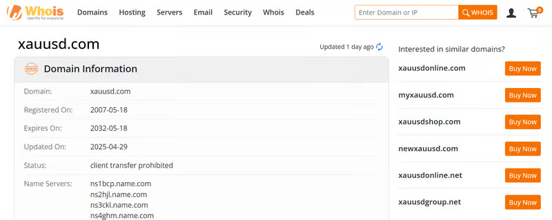 ドメイン「xauusd.com」は2007年5月18日に登録され、2025年4月29日に更新されています。