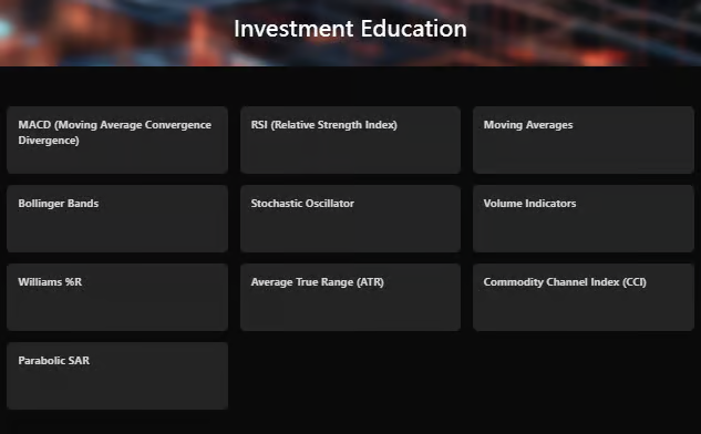 教育ページでは、MACD、RSI、移動平均線、ボリンジャーバンド、CCI、ATRなどのテクニカル指標を中心に解説しています。
